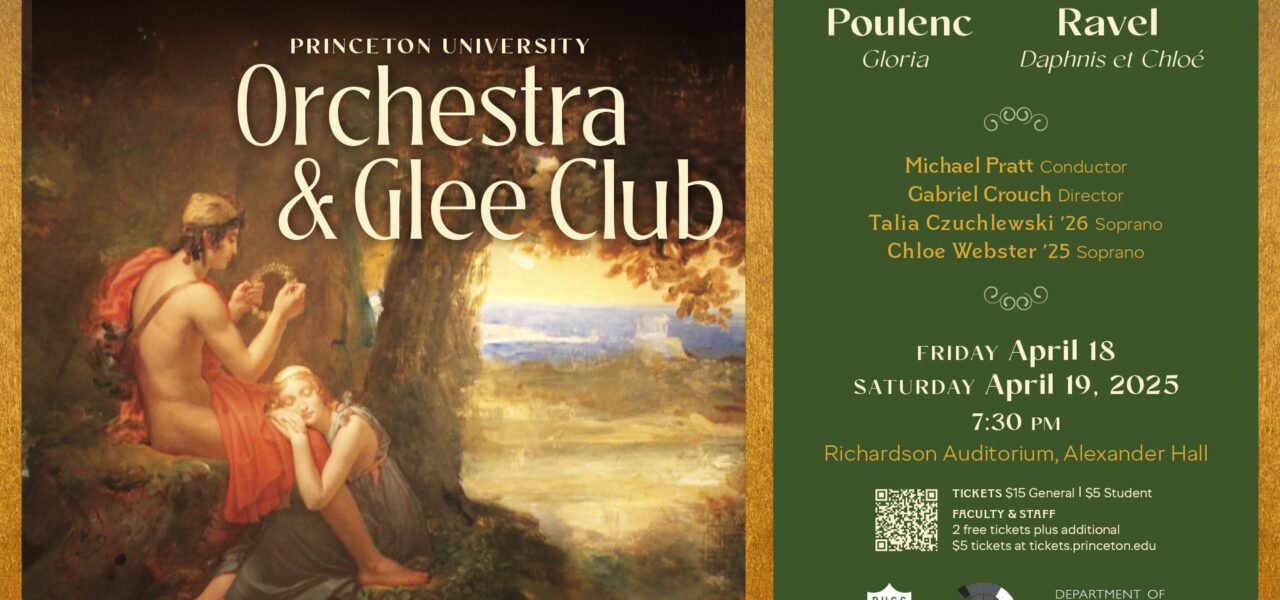 Princeton University Orchestra and Glee Club combine for two April concerts performing Ravel’s complete ballet Daphnis et Chloé, and Poulenc’s Gloria.